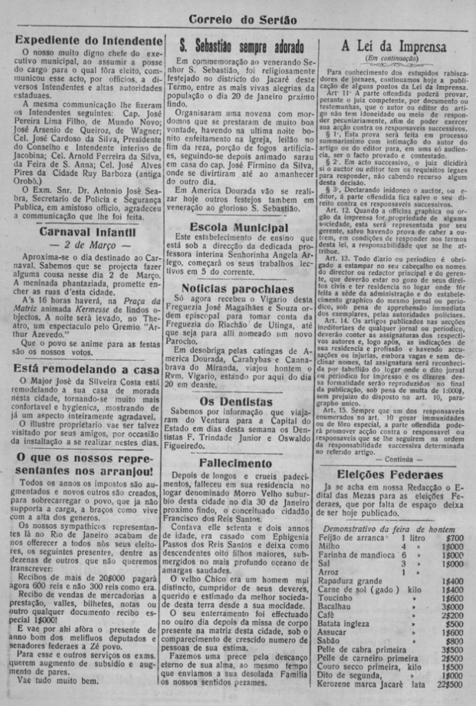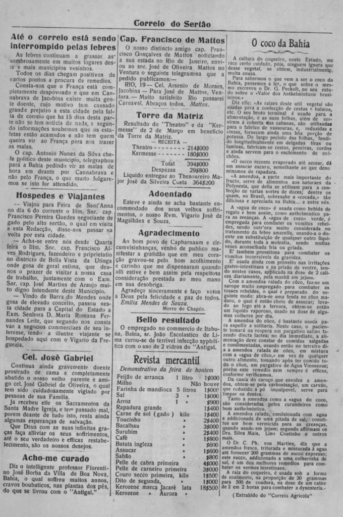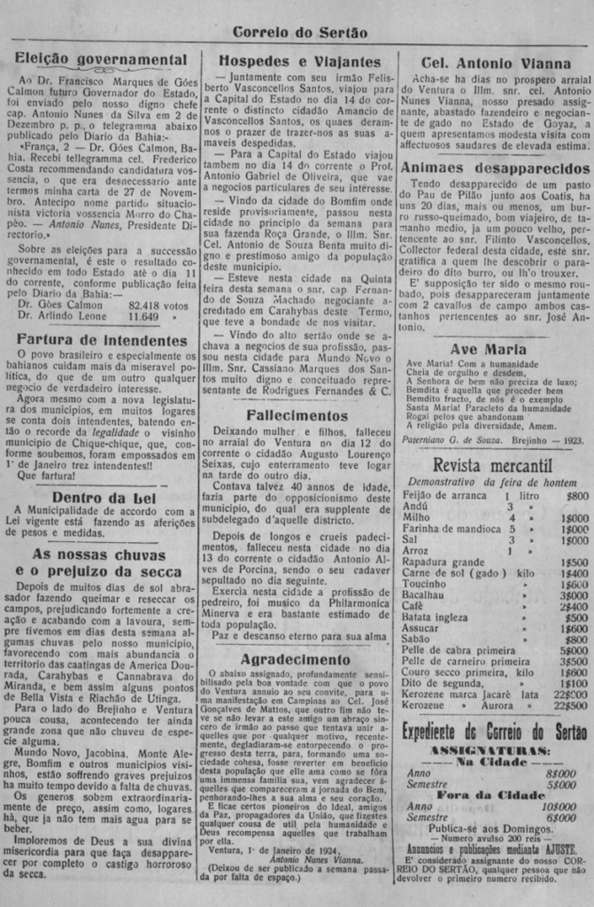Veremos hoje: Animais desaparecidos – As nossas chuvas e o prejuizo da seca (Jan.1924) – O que os nossos representantes nos arranjou (Fev. 1924) – Até o Correio está sendo interrompido pelas febres ( Marc. 1924)