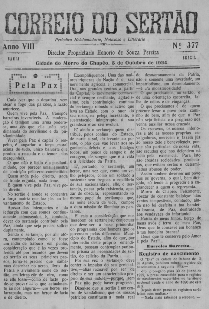 Todas as sextas-feiras, o Site jornalcorreiodosertao.com.br estará revivendo a história de nossa Morro do Chapéu e sua gente, como também matérias interessantes relacionadas a nossa região, levando você a fazer uma viagem no tempo destes 107 de vida do referido periódico, esse que é o 2º Jornal mais antigo da Bahia e o primeiro do interior ainda em circulação e que guarda em seus arquivos importantíssimos registros. A todos, uma boa viagem no tempo!