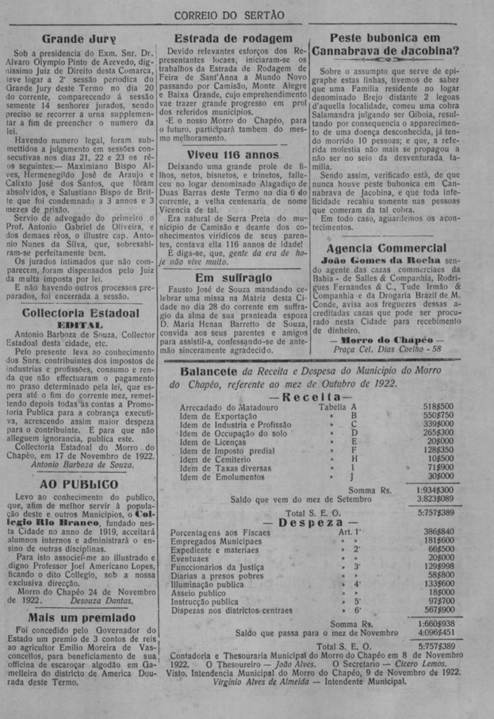 Veremos hoje: Viveu 116 anos em Duas Barras (Nov. 1922) – O Morro do Chapéo e suas riquezas naturais (Ago. 1923) – A Voz do Espaço… O Morro do Chapéo e a sua estrela (Set. 1923)