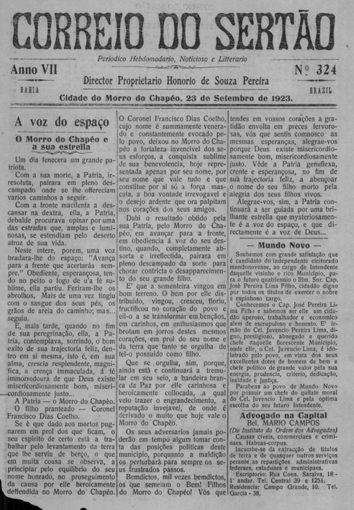 Todas as sextas-feiras, o Site jornalcorreiodosertao.com.br estará revivendo a história de nossa Morro do Chapéu e sua gente, como também matérias interessantes relacionadas a nossa região, levando você a fazer uma viagem no tempo desses 107 de vida do referido periódico, esse que é o 2º Jornal mais antigo da Bahia e o primeiro do interior ainda em circulação e que guarda em seus arquivos importantíssimos registros. Á todos, uma boa viagem ao tempo!