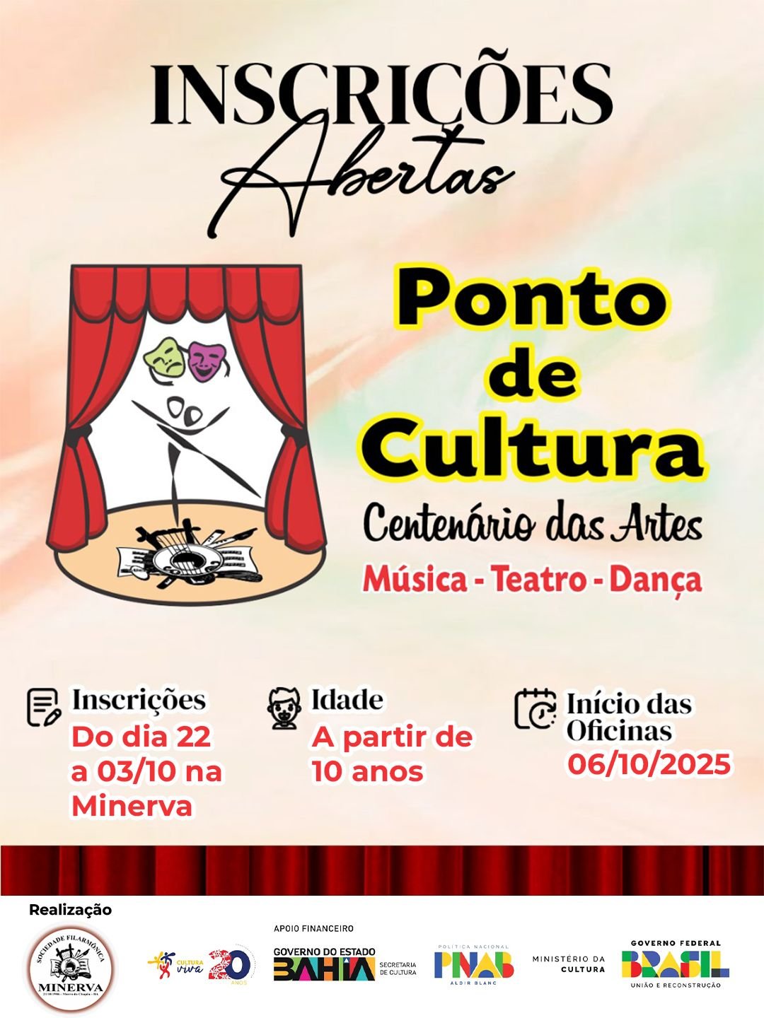 📅 Inscrições: 22/09 a 03/10 na Minerva – 🚀 Início das oficinas: 06/10/2025 – Vem viver a arte com a gente! – 🚨VAGAS LIMITADAS