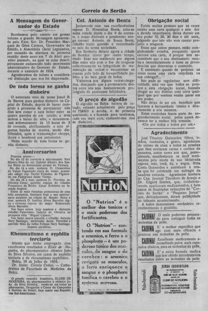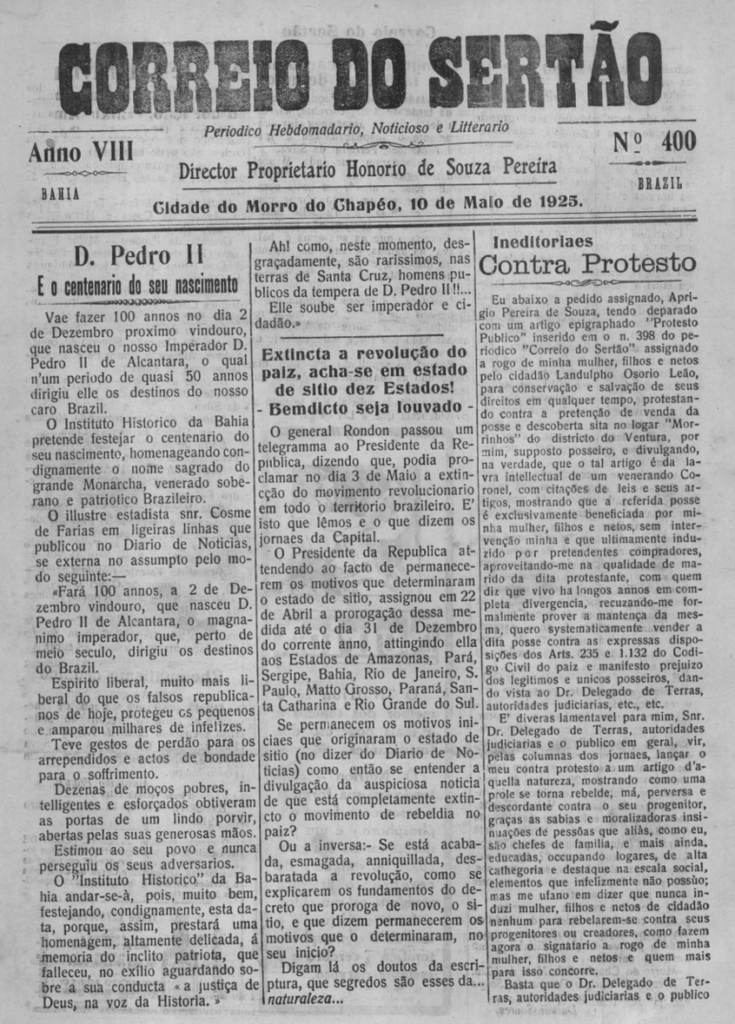 Todas as sextas-feiras, o Site jornalcorreiodosertao.com.br estará revivendo a história de nossa Morro do Chapéu e sua gente, como também matérias interessantes relacionadas a nossa região, levando você a fazer uma viagem no tempo destes 107 de vida do referido periódico, esse que é o 2º Jornal mais antigo da Bahia e o primeiro do interior ainda em circulação e que guarda em seus arquivos importantíssimos registros. A todos, uma boa viagem no tempo!
