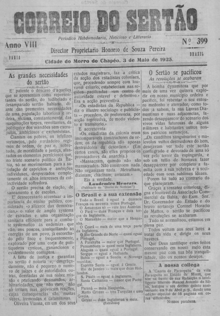 Todas as sextas-feiras, o Site jornalcorreiodosertao.com.br estará revivendo a história de nossa Morro do Chapéu e sua gente, como também matérias interessantes relacionadas a nossa região, levando você a fazer uma viagem no tempo destes 107 de vida do referido periódico, esse que é o 2º Jornal mais antigo da Bahia e o primeiro do interior ainda em circulação e que guarda em seus arquivos importantíssimos registros. A todos, uma boa viagem no tempo!