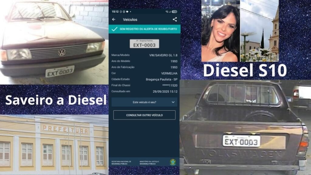 3.1. Por meio de consulta a aplicativo público de verificação de veículos (SINESP Cidadão), apurou-se que a placa EXT-0003 pertence a um veículo Volkswagen Saveiro, ano 1993, emplacado no Estado de São Paulo, cujo sistema de alimentação é compatível com gasolina e incompatível com diesel S10.