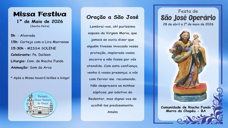Venham participar conosco do Tríduo e Festa de São José Operário na Comunidade de Riacho Fundo, que acontecerá de 28 de abril a 1º de maio de 2026. Contamos com vossas presenças!
