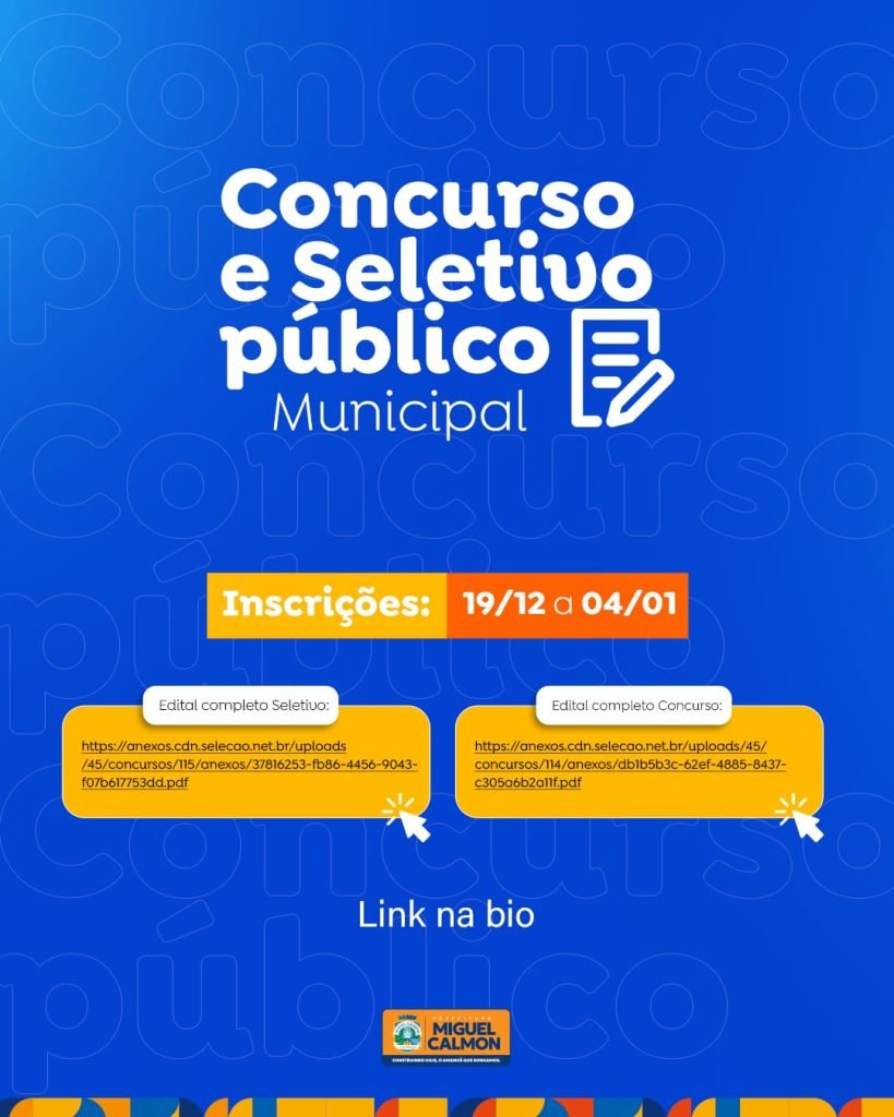 A Prefeitura de Miguel Calmon, no Piemonte da Diamantina, publicou o Edital de Concurso Público nº 001/2025, que trata da abertura de concurso público e processo seletivo para o provimento de cargos efetivos e formação de cadastro de reserva no quadro de servidores municipais. O certame é regido pelo regime jurídico celetista do município e está fundamentado no artigo 37 da Constituição Federal.