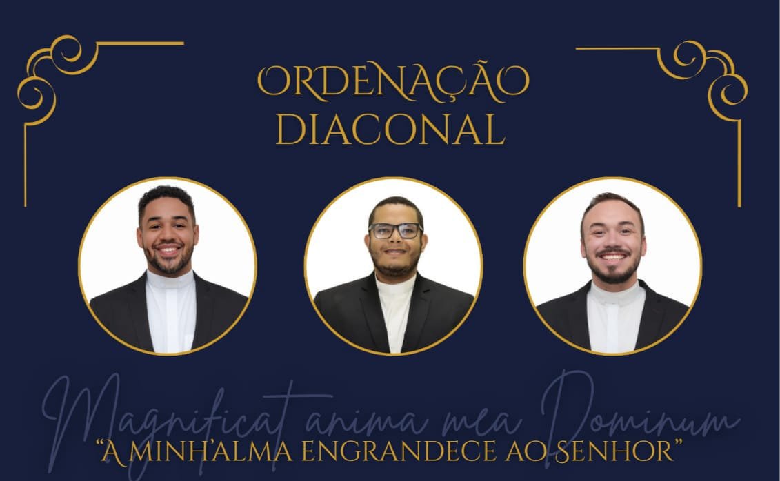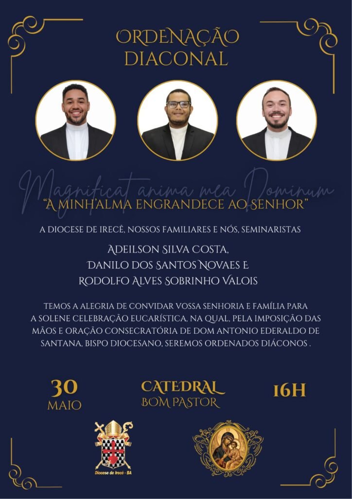 REGIONAIS Ordenação Diaconal dos Seminaristas Adeilson, Rodolfo e Danilo 13/04/2026 Correio do Sertão No dia 30 de maio, em Irecê, acontecerá a ordenação Diaconal dos Seminaristas Adeilson, Rodolfo e Danilo. A Diocese de Irecê convida o povo de Deus para a solene celebração.Unamo-nos em oração e ação de graças por este dom à Igreja. 📅 30 de maio📍 Irecê – BA Visualizações: 1 Compartilhe essa notícia