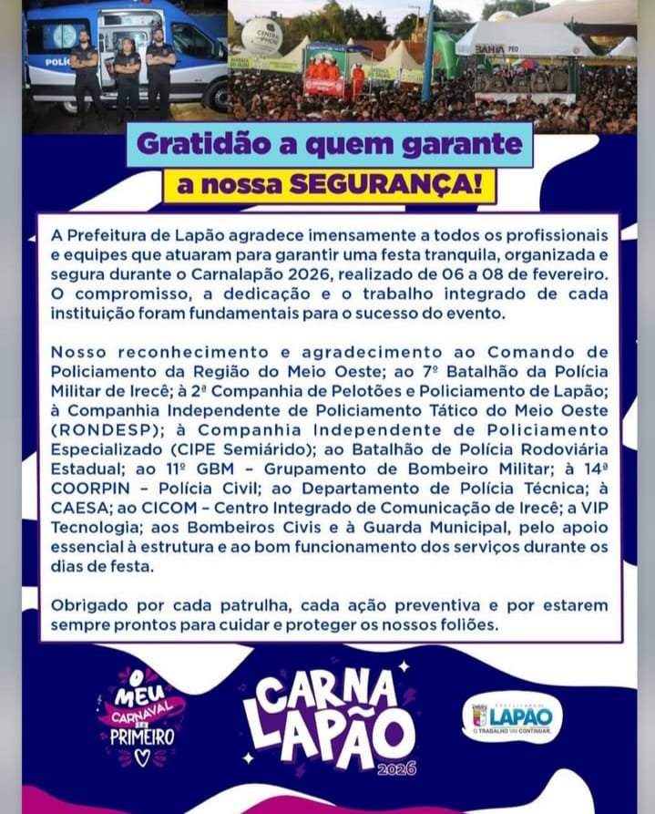 Está de parabéns a cidade de Lapão e de maneira especial ao prefeito Marcio Messias e sua equipe de trabalho, os quais fizeram um carnaval com muita organização, onde durante os três dias de festa os foliões se divertiram a valer, tanto no Barracão como na praça de eventos. Lapão que tem uma população estimada em 28 mil habitantes, já se tornou um exemplo de administração, não somente em festas, mas em todas as áreas que faz uma cidade se desenvolver e o povo ter uma qualidade de vida sempre melhor. Uma cidade organizada não somente na sede, mas também nos seus povoados e distritos, onde se vê no semblante de cada morador o orgulho de ser lapoense, pois é uma cidade que tem uma gestão que trata a todos com respeito e faz uso do dinheiro público com muita responsabilidade e transparência.