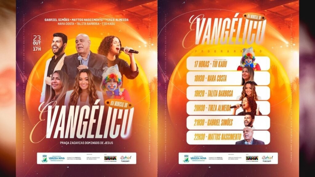O evento, que faz parte do calendário oficial do município, promete reunir fiéis de todas as igrejas evangélicas em uma noite marcada por louvor, emoção e comunhão. A programação contará com shows de Tio Kadu, Nara Costa, Talita Barbosa, Tirza Almeida, Gabriel Simões e o renomado Mattos Nascimento, um dos maiores nomes da música gospel nacional.
