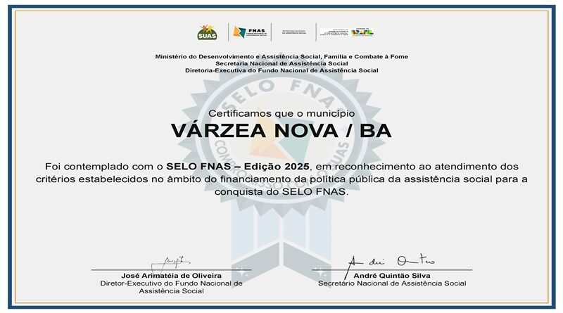 A Prefeitura de Várzea Nova alcançou, pela primeira vez, o Selo FNAS – Edição 2025, reconhecimento nacional concedido a municípios que se destacam na gestão dos recursos e na execução das políticas públicas de assistência social.