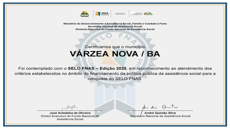 A Prefeitura de Várzea Nova alcançou, pela primeira vez, o Selo FNAS – Edição 2025, reconhecimento nacional concedido a municípios que se destacam na gestão dos recursos e na execução das políticas públicas de assistência social.